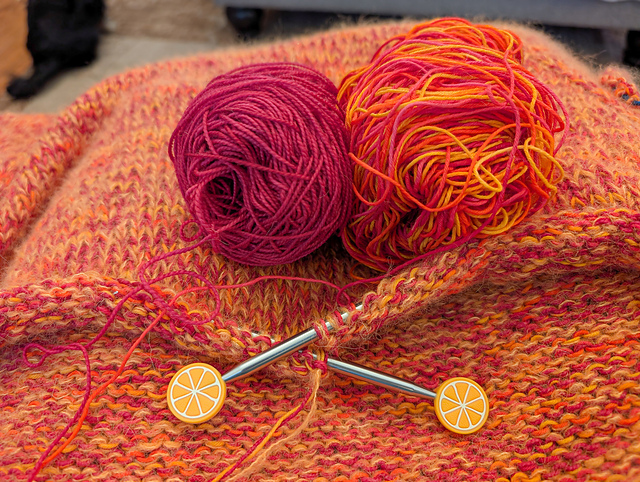 To really soften the handoff from one skein to the next, work a few rows of alternating 2-row stripes before switching fully to the new color.