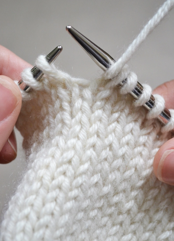 - When you work back over the double stitch, knit (or purl) both legs together.