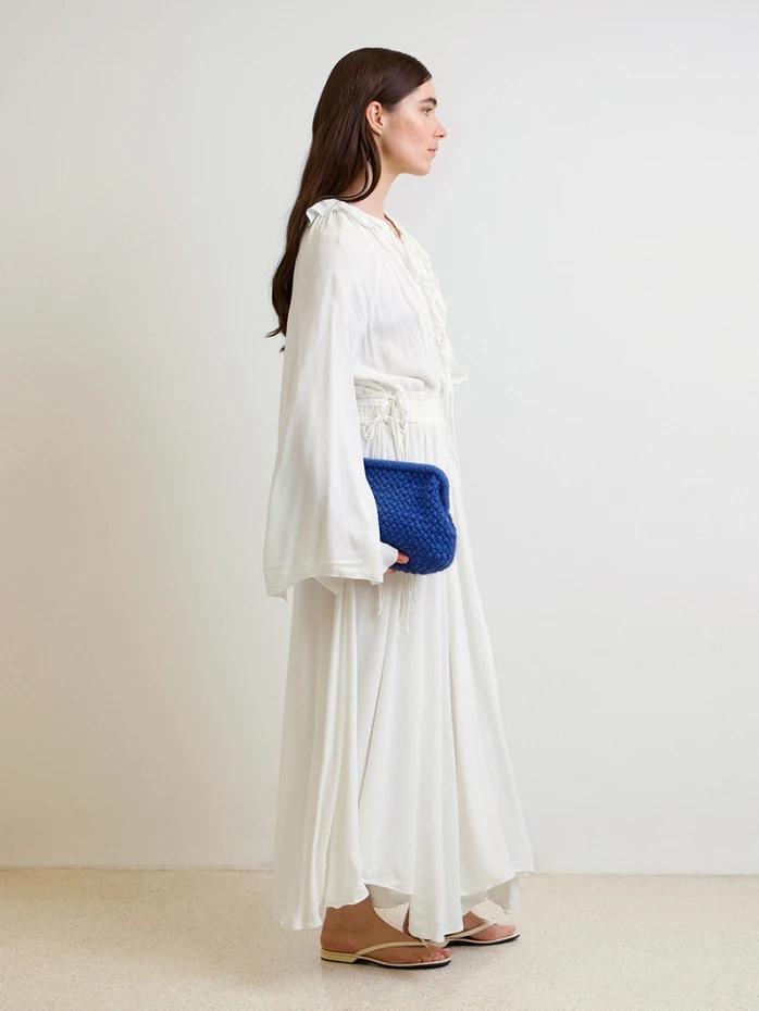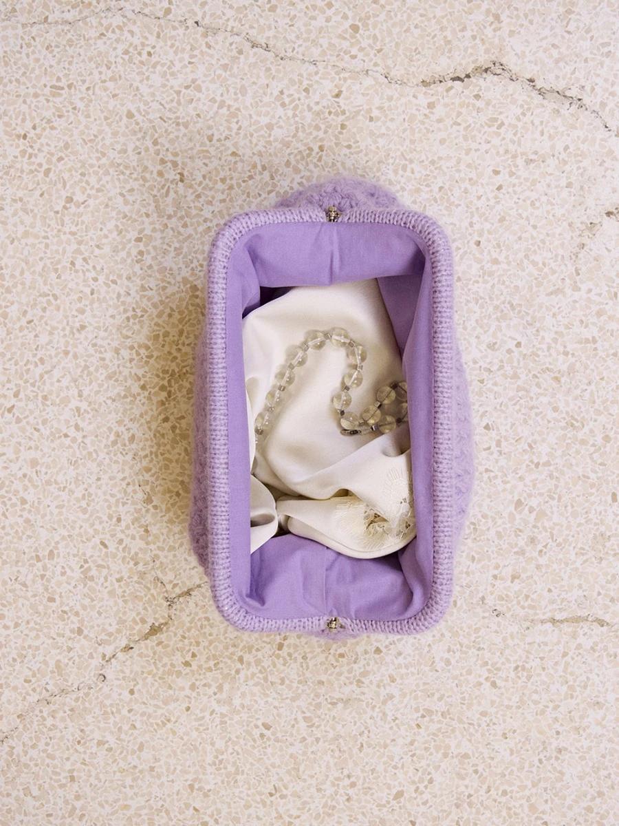 Decorative clutch crocheted from the bottom up using puff stitches, with a square base and a knitted edge folded around the clutch frame. The combination of Double Sunday and Tynn Silk Mohair creates a soft, lightweight and refined finish. Lined and assembled at the end.