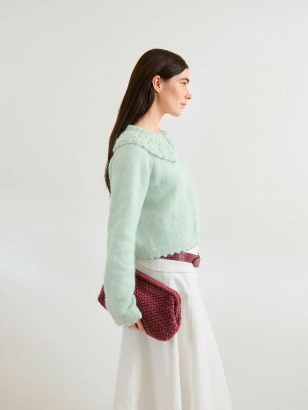 Decorative clutch crocheted from the bottom up using puff stitches, with a square base and a knitted edge folded around the clutch frame. The combination of Double Sunday and Tynn Silk Mohair creates a soft, lightweight and refined finish. Lined and assembled at the end.