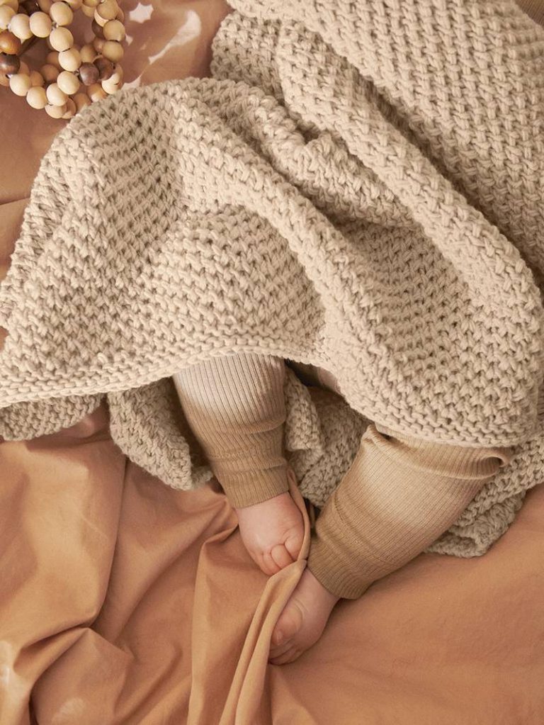The blanket is knitted back and forth with ribbed edges, the other stitches are knitted with a pattern with two strands of Tynn Merinoull.