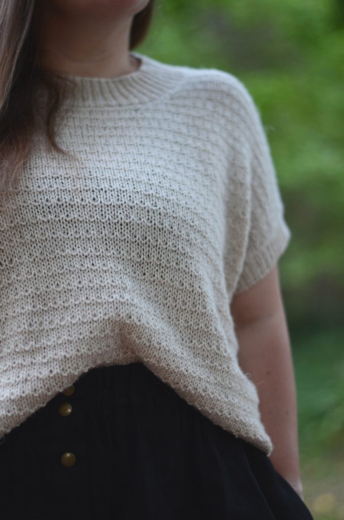 The Hiesu Sweater is designed to be your wonderful companion for the end of the summer days. It’s worked seamlessly from the top down, starting with the back. Then you will pick up the stitches for the shoulders and join for front and later for the lower body. The final touches are the collar and sleeve ribbings ending with a tubular bind-off.” – Veera Välimäki