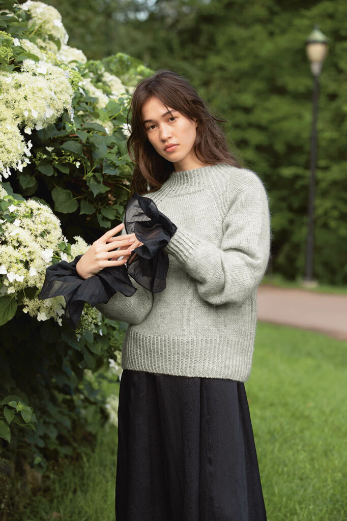 The Kelly Sweater is knitted top-down with raglan increases. The work is divided into sleeves, then the front and back pieces. The whole sweater is knitted with 1 strand each of Peer Gynt and Tynn Silk Mohair (held together).