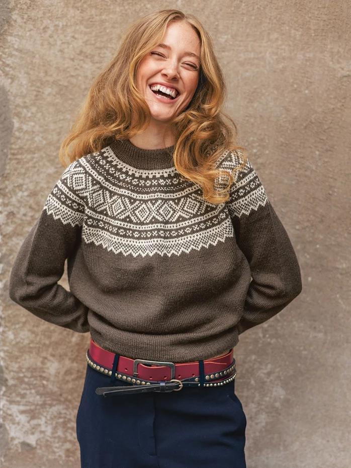 This Marius sweater in Tynn Peer Gynt has a soft A-line shape that gives a modern look to the classic pattern. It is knitted from the top down.