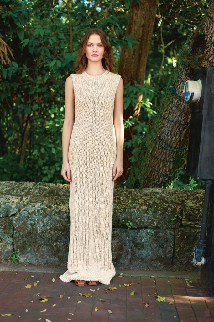 The dress is knitted top-down in half-patent stitch with 1 strand of Line and 1 strand of Mandarin Petit. You may also use a yarn alternative to Mandarin Petit.