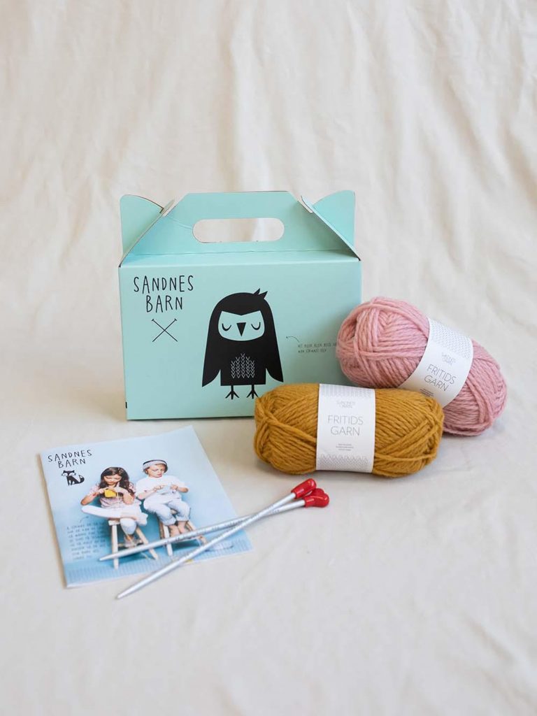 Children’s knitting kit – perfect for children who want to learn to knit! The package contains everything you need to get started: Instruction and pattern booklet, 2 skeins of FRITIDSGARN (select 2 contrasting colors below), needles (5 mm/US8)