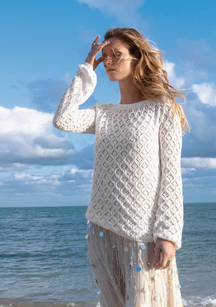 From Sandnes Garn Women’s Summer Pattern Book 1908 – Seabreeze Nr. 3 – is a versatile summer sweater pattern with gorgeous details knit in their lightweight linen blend yarn, Tynn (thin) Line.