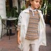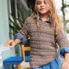 The sweater is knitted top-down in half-patent stitch with stripes in pearl rib in Line and Mandarin Petit.