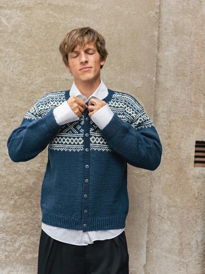 The Setesdal Men’s Cardigan without dots is knitted in Peer Gynt from the top down, featuring a traditional pattern and a classic men’s fit.