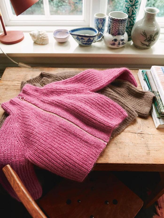 Begin to cast on sts for neckband, and work back and forth with rib-pattern. Cont and inc for raglan before divide sts on ndl for sleeves, back and front, and work each part in rib-pattern. Knit up sts for front bands, and work double knit. Sew zipper on.