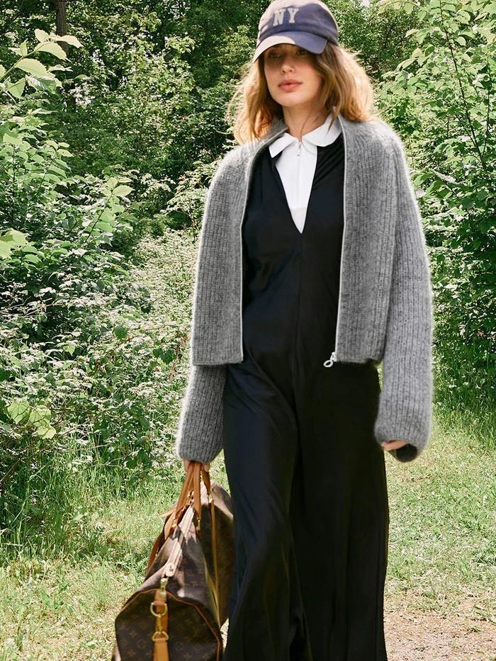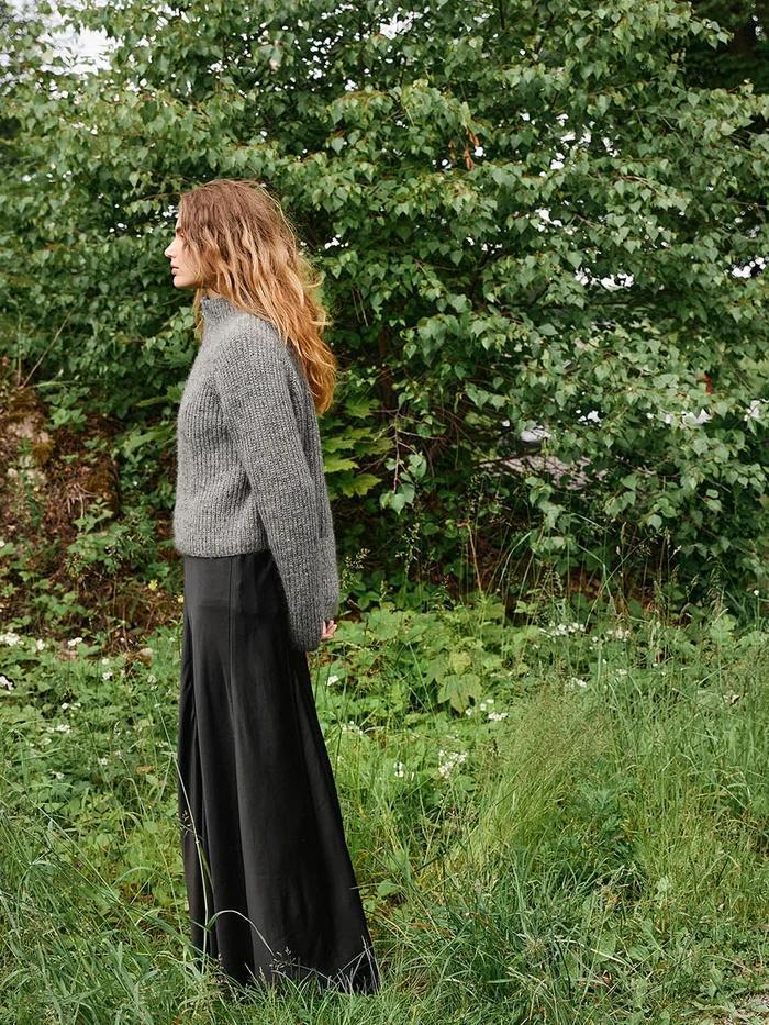 Tia Zipper Jacket in Sunday and Tynn Silk Mohair – a soft and modern half-patent cardigan with a zipper. Worked from the top down with one strand of each yarn for a light, warm and exclusive feel. Just as cool with a dress as with jeans or sweatpants.